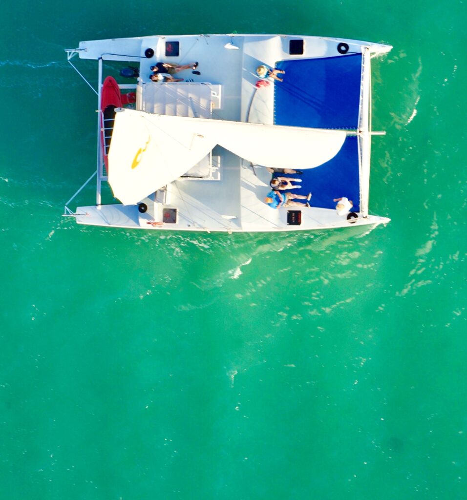 Welcome aboard the ‘Carolina Moon,’ a 37ft x 22ft open stiletto-style catamaran sailboat,